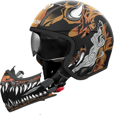 completed with brilliant graphics and colors aimed at satisfying even the most demanding bikers. Features The comfort of a jet helmet with the versatility of a fullface Aggressive lines, with a vaguely vintage and r...