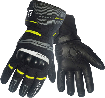 Features Waterproof, windproof & breathable Touchscreen function Safety Leather covered hard shell over knuckles of hand Super Fabric® slider & padding on the ball of the hand Material doubling Reflective elements Material Durable 600D Cordura® textile fabric Hipora® climate membrane Leather palm HIPORA® Hipora is a waterproof & breathable fabric most commonly used as an insole in winter, motorcycle & bicycle boots. Hipora consists of a three-layer microporous silicone coating. The first layer prevents the penetration of water. The second layer is a honeycomb structure that allows moisture to pass through, thus displacing it through the first layer. The third layer is very dense & provides additional protection from water. This is the layer that is closest to the skin. Invista™ Cordura® Invista™ Cordura® is a trademark of Invista™ Inc. & refers to an air textured nylon yarn. Cordura® is the most widely used textile face fabric when versatility, reliability & durability are needed in a product. It offers high abrasion & tear resistance, much better than other man-made fibers or cotton fabrics. Cordura® consists of 100% polyamide as the chemical base material & the melting point is about 210 °C. The fabric is available in different variants for different applications. In the motorcycle sector, a 500 D Cordura® fabric is typical.