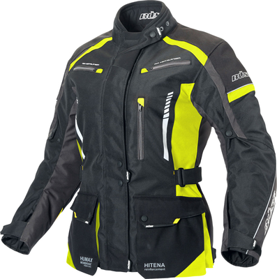 Features Waterproof, windproof & breathable due to integrated Humax® climate membrane Removable thermal lining Comfort collar with neoprene cuff Adjustable collar closure Ventilation at shoulder & back Width adjustable (waist, hips, sleeves) Connecting zipper, 3 outer pockets, 2 of them waterproof, 1 inner pocket Safety Removable YF® protectors (shoulders, elbows) SAS-TEC back protector can be retrofitted, safety seams (ISO 4916) Reflective elements Material Durable 600D polyester fabric Polyamide ripstop inserts Humax® climate membrane Material reinforcement (shoulder, elbow) Breathable mesh lining Hitena® Hitena® is an abrasion resistant textile material made from highly twisted yarn. It is a very strong material, yet has a soft handle, is consistent in shape & lighter than ordinary polyamide.