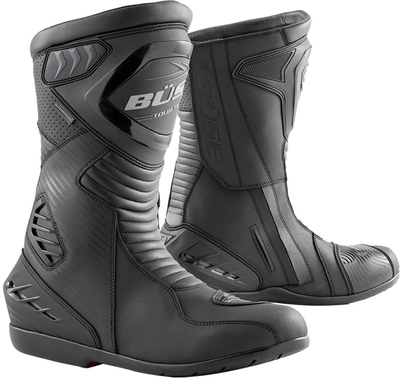 Features shinbone & heel reinforcement made from sturdy plastic toe reinforcement gear lever reinforcement lateral zipper closing with cover comfort padding at heel & instep comfort lining ventilation in the heel & ankle area PU coated leather 3-layer climate membrane rom Hipora, water & windproof, breathable robust, cut-resistant anti-slip sole oil & petrol resistant