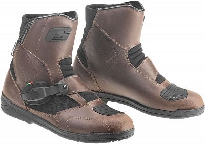 A sport touring short boot, upper made from leather, it incorporates Drytech waterproof membrane & lightweight microfiber on front & rear for more flexibility & comfort. Ankles protector & Reflex insert. Featuring a new lateral closure with one buckle & velcro strap for easy & precise closure. Rubber sole for grip & control on the bikes foot pegs. ...