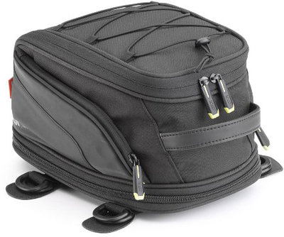 Givi Easy-T EA132B universal rear bag. Features Material polyester 600D Polyurethane inserts Non-slip PVC Matt black reflective material 2 straps for attaching to the saddle 2 side pockets with zipper Elastic multi-purpose strap for additional fastening Front handle Neon yellow rain cover Expandable from 8 to 11 liters Reflective inserts for high visibility at night Reflective motif prints for better visibility Capacity approx. 11 liters