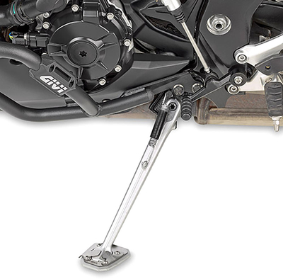 Specific foot extension made of aluminum and stainless steel for the original side stand. Notes GIVI products are designed for vehicles in their original condition. Compatibility with accessories from other manufacturers, such as exhaust systems, etc., cannot be guaranteed and may need to be checked before installation. Some of the images are examples or placeholders.