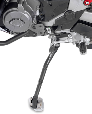 Specific foot extension made of aluminum and stainless steel for the original side stand. Notes GIVI products are designed for vehicles in their original condition. Compatibility with accessories from other manufacturers, such as exhaust systems, etc., cannot be guaranteed and may need to be checked before installation. Some of the images are examples or placeholders.