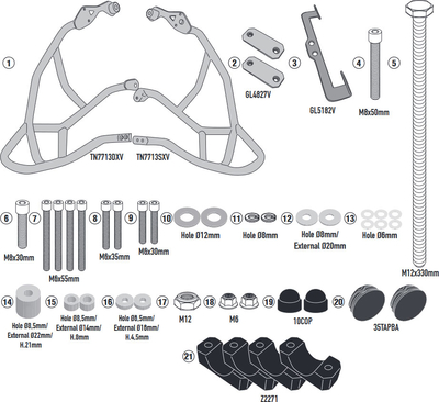 Model-specific crash guards. Features Tube diameter in most variants 25 mm Please note the variant-specific comments/restrictions Important note GIVI products have been developed for vehicles in their original condition Compatibility with accessories from other manufacturers cannot be guaranteed It is recommended that the installation be carried out by a professional mechanic Comments/restrictions Variant Note TN1110 TN1111 TN1121 TN1139 TN1144 not compatible with CRF1000L Africa Twin DCT TN1144OX Stainless steel, not compatible with CRF1000L Africa Twin DCT TN1156 TN1160 TN1162 for Honda CRF1000L Africa Twin DCT TN1162OX Stainless steel, for Honda CRF1000L Africa Twin DCT TN1171 TN1178 Compatible with both DCT & manual transmissions TN1184 TN1192 TN1194 TN1196B TN1199 TN1201 TN1203 TN1208 TN2105 TN2122 TN2128 TN2130 TN2132 TN2139 TN2145 TN2148B TN2158 TN2159B TN2165 TN225 TN3101 TN3105 TN3116 TN3117 TN3125 TN3126 TN3127 TN3128 TN347 TN355 TN358 TN362 TN363 Tube diameter 22 mm TN365...