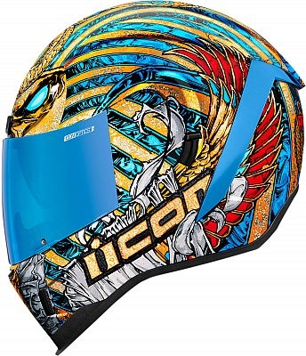 Did you think we would leave the Pharaoh graphic undisturbed for eons in a dark tomb, unable to drink from the bowl of Osiris in the halls of eternity? Wow, you really don’t know us, do you? The Pharaoh is back, anointed linens & all. This time the greatness is bestowed upon our Airform™ shell. Preserve your head in opulence with enough flake & foil to make Tutankhamun jealous. Combine that with our Hydradry™ comfort liner, cutouts in the EPS for your communication device, fog-free shield, & Drop Shield™, & you have a helmet fit for a king.. .errr... Pharaoh. Features Injection molded polycarbonate shell for strength & durability Internal airflow geometry Continuous venting system Sculpted neck roll Fog-Free Icon Optics™ Shield with Rapid-Release™ System Prolock™ positive shield locking system Trac Shield™ shield with tear-off posts available sold separately Internal Dropshield TM with exterior switch The DROPSHIELD™ visor must only be used while the main face shield is in the fully closed position Removable molded breath deflector Removable Hydradry™ 3-piece moisture wicking liner Internal speaker pockets work with Icon s R.A.U. Bluetooth device World Standard Meets DOT FMVSS 218 (US), ECE 22.05 (EUROPE) & PSC (JAPAN) helmet safety standards. Does not ship with PSC certification stickers unless purchased from an authorized dealer in that country. Fit The most common helmet fit type, the Intermediate Oval head is slightly shorter front-to-back & a little wider side-to-side. Venting 4 air intakes & 1 exhaust port are coupled with deep channeling in the interior energy absorbing EPS foam to keep your head cool. Weight A reduced shell profile helps reduce overall weight, while maintaining the exclusive World Standard of ICON to suit your riding style. Exterior Streamlined & race inspired, the Airform hits the street ready for speed. By sculpting the traditional neckline of the Airform it allows your head to slip in & out with ease. The helmet s continuous chinbar venting system allows air to freely flow keeping you cool on those hot riding days. Customize your helmet & colormatch your interchangeable spoiler to your shield for a unique personalized look. Shield The Airform has not one, but two shields. The unique quick-change fog-free Optics shield keeps debris away from your money maker, while the internal interchangeable drop shield has the sun in check. No more swapping shields for cloudy or sunny days. Just reach up, flip the switch, & ride forever. Interior The removable sweat wicking Hydradry™ liner provides a snug & contoured fit. Air from the vents is channeled between the comfort liner & the protective, energy absorbing EPS foam liner to create a nearly perfect rider-focused interior. The airflow works in conjunction with the Hydradry™ liner to effectively reduce heat build up. Combine that with superior venting & a removable breath deflector, which creates a nearly perfect rider-focused enclosure. Note Please be aware, as long as nothing else is written in the item description: All helmets will be delivered only with the ECE certification by default all helmets that have a visor will be delivered with a clear visor, even if it is shown differently. ...