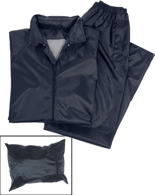 Features Very lightweight weather protection suit for leisure activities, with small pack size (incl. bag) Weight: 200 gr./sqm Water column: 3, 000 mm Jacket with front zipper & integrated hood in the collar 2 side slit pockets waistband with cord & stopper Wide trousers with 2 reach-through pockets Waistband with elasticated drawstring Leg cuffs with press-stud ...