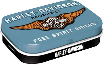 Endless space, breathtaking nature, boundless freedom. The American way of life captivates millions. Hardly any brand embodies this myth as originally & unfiltered as Harley-Davidson. The film Easy Rider with Peter Fonda & Dennis Hopper gave the brand cult status in 1969. The two chopper conversions Captain America with the famous US livery & the compact Billy Bike decorated with flames became cult models & triggered a wave of individualization by Harley-Davidson owners that continues unabated to this day. Features Tin made from sturdy sheet steel Filled with 15 gr. high quality peppermint lozenges Practical hinged lid Lid motif embossed on several levels
