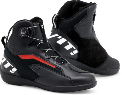 Every detail, every stitch & every seam of the new Jetspeed Pro shoe leads back to the racetrack. Its aerodynamic profile & the eye-catching REV IT! Graphics on the heel emphasize the racing pedigree. To top it all off, the BOA® Fit System allows for micro-adjustment (push in to engage, twist to tighten & pull up for quick release) that achieves the ideal fit in moments, even when you re wearing gloves. Maximum protection The Jetspeed Pro is designed for sporty riders who want optimal control with the highest level of protection. That means finding a precise balance between form & function to enhance the feeling of being one with the bike. The efficient, smooth & lightweight construction makes your every gear change & braking maneuver easier. The SEESOFT ankle disc & heel guard are unobtrusive yet highly effective. Airflow for your flow It s one of those rides where your feet start to cook as the sun bounces off the asphalt, all while you re trying to get into the flow. Luckily, that s when the Jetspeed Pro shoe is in its element. Natural & synthetic materials like soft, abrasion-resistant cowhide & highly ventilated PWRMesh keep your feet protected from heat & wick away moisture. The bottom line is that this sporty summer shoe provides maximum air circulation & minimal distraction. Features Oiled suede upper, PWRmesh, seamless TPU film 3D mesh lining Perforation on the sides Boa® L6 Platform Closure Construction with sewn tongue Ortholite X40 Hybrid insole Reinforced heel Reinforced toe area SEESOFT ankle discs Rubber sole Rubber shifter reinforcement Reflective material on the heel These boots or shoes are certified according to EN 13634 standard, published in 2017 & meets protection standard Level 1 1 2 1 Boa® Closure System The unique Boa® closure system makes for a perfect fit, an extremely fast closure & a very light-weight boot. Enter the shoe, push the knob to engage, turn it for the perfect fit, & pull up on the knob for a quick release. Once locked in place the Boa® reels & laces stay that way. Made from aircraft-grade stainless steel, Boa® laces are stronger per gram than tank armor. PWRMesh The PWRMesh has a knitted, open structure that combines breathability with flexibility. It is also very abrasion resistant to protect motorcyclists on the road. Ortho Lite® It feels like you re walking on air. The Ortho Lite® X40 insoles with which Revit equips all motorcycle boots & shoes are a key factor in comfort. The Ortholite® X40 insole has highly resilient & elastic properties. It absorbs vibrations transmitted from the motorcycle to the rider s feet. These cushioning properties help combat fatigue during a long day of riding. By partnering with Ortholite®, a leading manufacturer of innovative OEM insole foams, Revit is able to provide an exceptional level of comfort in its footwear. Not only that, but unlike traditional insoles, the compression set of Ortho Lite® insoles is less than 5 percent over time. The compression set indicates how much a material permanently deforms under load. This low value means that the cushioning effect of Ortho Lite® insoles & thus the fit of the shoe do not change significantly, which ensures maximum wearing comfort even in the long term. The washable insoles are lightweight, breathable & moisture-regulating thanks to the open-cell polyurethane foam, which is 95 to 100 percent breathable.