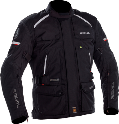 Features Outer shell: 500d airguard ripstop fabric+ spandex Gore-tex® ltd 3 layer membrane (removable membrane) Polyester mesh lining. Thermal fleece lining D3o® protectors at elbow & shoulder, in accordance with the standard en 1621-1:2012 (level 1) D3o® back protector, ce certified in accordance with the standard en 1621-2:2014 (level 1) Detachable thermo jacket with 2 outer pockets. 2 waterproof side pockets (velcro closure) 1 extra large waterproof storage bag in the back (closure: zipper & velcro) 2 wallet pockets & 1 smart phone pocket in the outer shell. (velcro closure) Comfortable neoprene collar. 1 wallet & 1 smart phone pocket in thermo lining (velcro closure) 1 napoleon pocket in outer shell (zipper closure) Retro reflex technology assures a higher visibility. Waist adjustable via belt & push buttons. Width adjustment on upper arm & cuffs (velcro & zipper system) Maximum ventilation via air vent panel & zipper on chest & back. (zipper & velcro/magnet closure) Ventilation zone on forearm via (zipper) Long & short connecting zipper (connects to any richa trousers