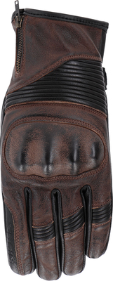 Features Vintage look waxed leather gloves with flexible knuckle protector Accordion stretch inserts for optimal fit Soft jersey lining Wrist closure with velcro Adjustable YKK zipper on cuff for optimal fit Certified knuckle protector Touchscreen functional Homologation EN 13594:2015 KP