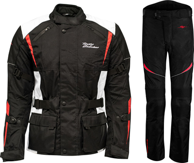 Basic & affordable. Those are the keywords for the Tommy suits. The Tommy suit is different from the original Rusty Stitches products. It’s a complete outfit & it’s the perfect outfit for beginning motorcyclists. The back & the knees of the Tommy are stretchy so that you have all the freedom of movement you need while riding your motorcycle. The removable flexible protectors on the shoulders & elbows ensure your safety without compromising wearing comfort. The Tommy can easily be upgraded with a D30 back protector. Features Tommy jacket Certified Level AA Certified approved shoulder & elbow protection Universal back protector pocket Fixed mesh liner with water-resistant membrane Thermal removable liner Water-repellent zippers Ventilation on the chest, back & arms. Neoprene inserts Reflectors Adjustable at the arms, wrist & waist Connection zipper for the Tommy Pants Multiple stretch area’s for extra comfort 2 pockets outside & 2 on the inside Tour jacket Features Tommy pa... ...