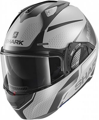 The ultimate evolution of the original EVO concept. SHARK, the creator of the EVO concept, goes even further with a « Grand Touring» model of its newmodular helmet: the EVO-GT. Always comfortable, whether in the full-face or jet position, the EVO-GT is the latest addition to the EVO concept. As comfortable in the jet as in the full face position, this premium model benefits from the latest SHARK innovations to satisfy the most demanding users. Rugged, comfortable & practical, the EVO-GT eats up the miles: it is the ideal partner whatever the route! Switching from a jet to a full face helmet has never been so easy & safe. Unequaled premium comfort both statically & dynamically. This new generation modular benefits from the patented Auto-up & Auto-down shortcut system, which allows the screen to automatically rise when the chin bar is adjusted. Equipped with a Class 1 optical screen, it offers incomparable quality of vision. The EVO-GT is equipped with the “V-Tech Locking System” which allows optimised locking of the chin bar for increased safety & ergonomics. Structure & safety Injected thermoplastic shell Micrometric ring strap Multiple density EPS 2 shell sizes (XS-S-M & L-XL) Homologation ECE 22.05 Visor New generation «optical class 1» VZ 250 visor with variable thickness: premium optical quality with no visual distortion The Pinlock 120 Max Vision®, best anti-fog lens on the market, comes in the box Rugged & strong visor with anti-scratch treatment internal sun visor with central slider: a mechanism that can be used with either h&, practical & easy to use Inside Microtech fabric with the AEGIS label (removable & machine washable at 30° C). Custom fit (2 cheek pad sizes included) Easy Fit system for those who wear eyeglasses Retractable breath guard King Size available Aerodynamics & ventilation Premium ventilation system to ensure optimum air circulation inside the helmet & internal cooling (3 air inlets & 2 air extractors) 3 air inlets 2 air extractors Aerodynamics optimised by means of CFD (Computational Fluid Dynamics) design studies Weight Ca. 1.650 gr. +/- 50 gr. Standard cheek pads Size XS S M L XL K-S mm 15 25 15 25 15 10 Note Please be aware, as long as nothing else is written in the item description: All helmets will be delivered only with the ECE certification by default all helmets that have a visor will be delivered with a clear visor, even if it is shown differently.