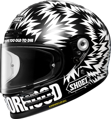 Please Note We are not allowed to ship this item outside the EU. The neo-retro road helmet Shoei Glamster-06 Death Spray Custom - Style for Miles The Shoei Glamster-06 Death Spray Custom is the stylish helmet for male and female riders who are looking for a classic retro look, yet don t want to sacrifice modern features. Its compact AIM fiberglass helmet shell made of multiple fiber materials, the classically shaped visor, the novel visor mechanism and the stylish ventilation inlets give this helmet an authentic look. As with all current Shoei helmets, the inner lining is completely removable and washable. Its minimal weight makes it equally popular with both male and female riders. Safety Shock absorbing helmet shell made of AIM Multi-part polystyrene core system of different damping