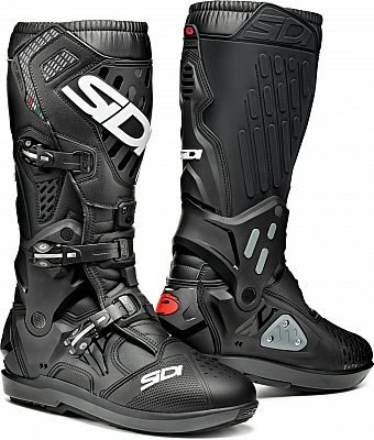 A Motocross boot must be durable, comfortable & manufactured with high quality materials to ensure the driver a good sensitivity: the ATOJO SRS motocross boot has all these features & has also been significantly reduced in weight compared to previous models, without compromising the protection The height of the boot reflects the requirements of our professional athletes who have helped us to develop & test it SRS Dovetail soles The SRS interchangeable sole has an innovative design & revolutionary replacement system Design & technology are patented by Sidi The central part of the sole consists of a replaceable rubber insert designed with a new interlocking system & 4 screws for safety Flex System Atojo SRS has two bending points The first joint under the ankle, to reduce thickness & make the boot smoother & more aerodynamic on the inside The support brace placed inside has a limited excursion to prevent hyper-extension of the ankle, of the instep & of the back tendon The second joint, above the ankle, which works in sync with the first one, improves the flexibility of the boot without compromising the rigidity & lateral protection Hyper Extension System Three removable anti hyperextensions systems, the first on the first joint, the second on the back of the boot & the third is frontal & is made up of an innovative system that, through a screwed & replaceable insert, allows a specific tibia flexion range & freezes if bending is excessive Calf Section The boot leg is equipped with a suede calf section cover enriched with embossed rubber inserts which, in addition to providing good grip in contact with the bike, have the function of protecting the leg from heat The rubber inserts are also placed on the inside of the ankle Velcro & buckle closure system ATOJO SRS uses a 3-buckles closure that work independently of each other Each closure consists of a toothed strap & a hook with a micrometric adjustment memory Buckles, straps ens hook are replaceable The upper part of the boot has a velcro closure with a soft rubber terminal, for wider adjustment Shin plate Anatomically shaped PU shin plate, whose structure also extends under the upper for more protection Certified EN 13634