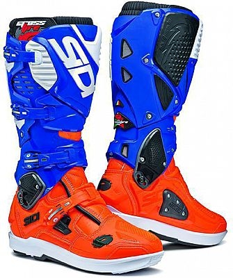Sidi presents the third generation of the number one offroad boot. The brand new Crossfire 3 is made from " Technomicro" & features polyurethane (PU) protectors. The tongue of the inner liner with inner gusset as well as the rear joints are padded with microporous material to prevent water & sweat absorption. The newly added plastic insert at the top also provides more grip & thus better grip in the boot. In addition, the boot is equipped with a metatarsal protector. The plastic insert is fixed with four screws & can be exchanged. Sidis Crossfire also impresses with a new design. The anatomically shaped heel is also made from PU. The foot is optimally protected in case of twisting. Features Upper in full grain leather & lorica Lined with cambrelle & air teflon mesh Replaceable shin plate Micro adjustable buckles Anatomically shaped heel Adjustable calf system Dual flex system Anatomically shaped heel Boot leg Metatarsus protection SRS sole Nylon inner sole with removable arc support All parts of the boot can be replaced Certified EN 13634 Replaceable shin plate The thermoplastic front shin plate, with innovative graphic designs, is anatomically shaped & replaceable. Micro adjustable & replaceable buckle system The Crossfire 3 SRS utilizes four micro adjustable buckle closures, with indented memory-regulation straps. The buckles, straps & retaining clips are easily replaceable. The buckles have just one fixing point (by a screw), which allows them to be easily closed making the boot adaptable to the rider’s position. You will note that all four buckles work independently from each other. This system allows the boot to fit all shapes of feet & lower legs independently making each boot that much more comfortable for each individual rider. Hyper Extension Block The Crossfire 3 SRS has 2 articulated joints: the first one on the ankle, called “HYPER EXTENSION BLOCK”, with completely revolutionized technology. It prevents the hyper extension of the ankle, the instep & the posterior tendon when the leg is flexed forwards or backwards. This technology guarantees the rider’s safety. Flex system The upper pivot, on the bootleg, improves the flexibility of the boot & the adjustment of the bootleg itself. In this way, the rider can adjust the boot strap at the calf to his personal preference & achieve an enhanced fit. Adjustable calf system The boot leg has a replaceable inner calf plate, produced in PU & a printed rubber insert, to protect the leg from exhaust heat, wear & tear. The calf plate features an inner double adjustment, which allows to widen the circumference of the boot & accommodate even wider calves & shin guards. This adjustment was increased for greater performance. Protection A